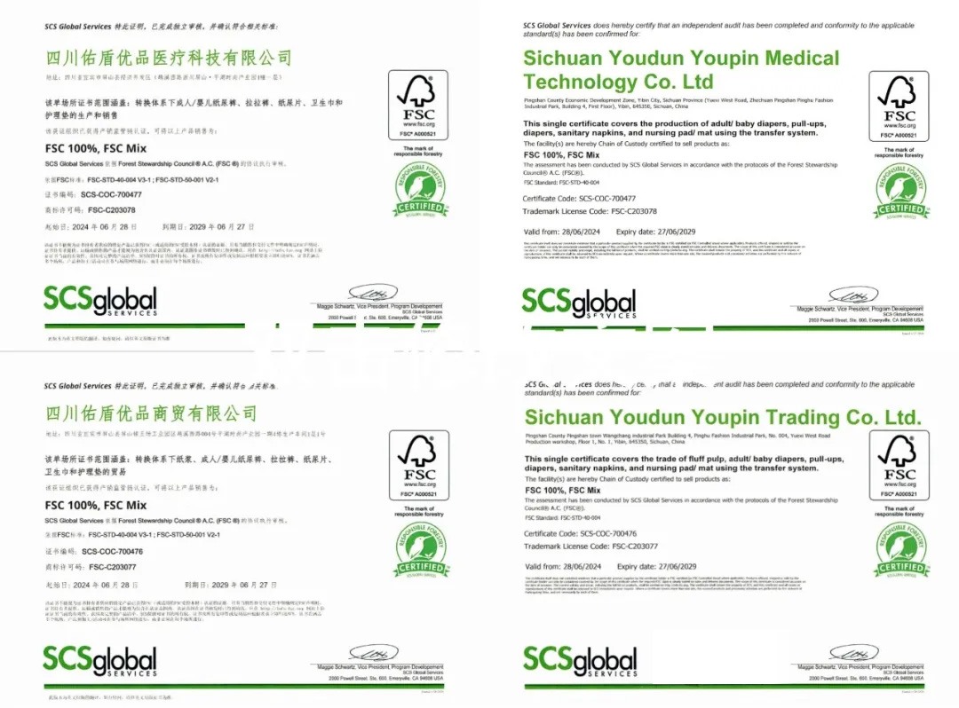 四川佑盾优品医疗科技有限公司自成立已过去三年,在企业发展过程中,始终秉持“绿水青山就是金山银山”的绿色可持续发展理念,针对采购、仓储、生产、成品、销售、财务等各个环节进行了全面的优化。通过各部门的通力合作与不懈努力,今年 6 月,公司顺利通过认证,荣获森林管理委员会的认可。目前,我司旗下的四川佑盾优品商贸有限公司也获得了 FSC 认证。在产品结构优化的基础上,完成了整个供应链管理的体系升级,为企业的高质量发展增添了强大动力。