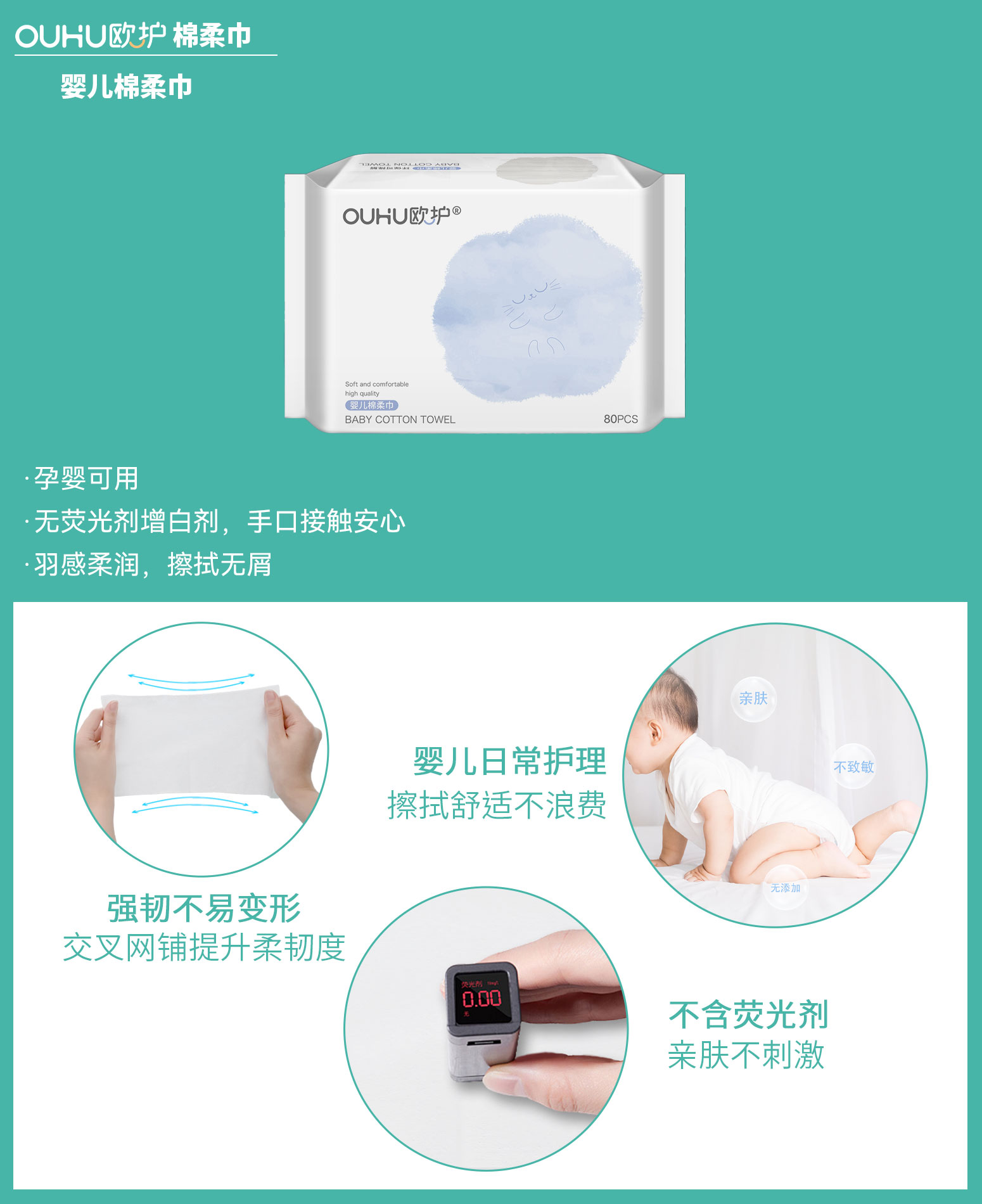 描述:·孕婴可用·无荧光剂增白剂,手口接触安心·柔软细腻·羽感柔润,擦拭无屑