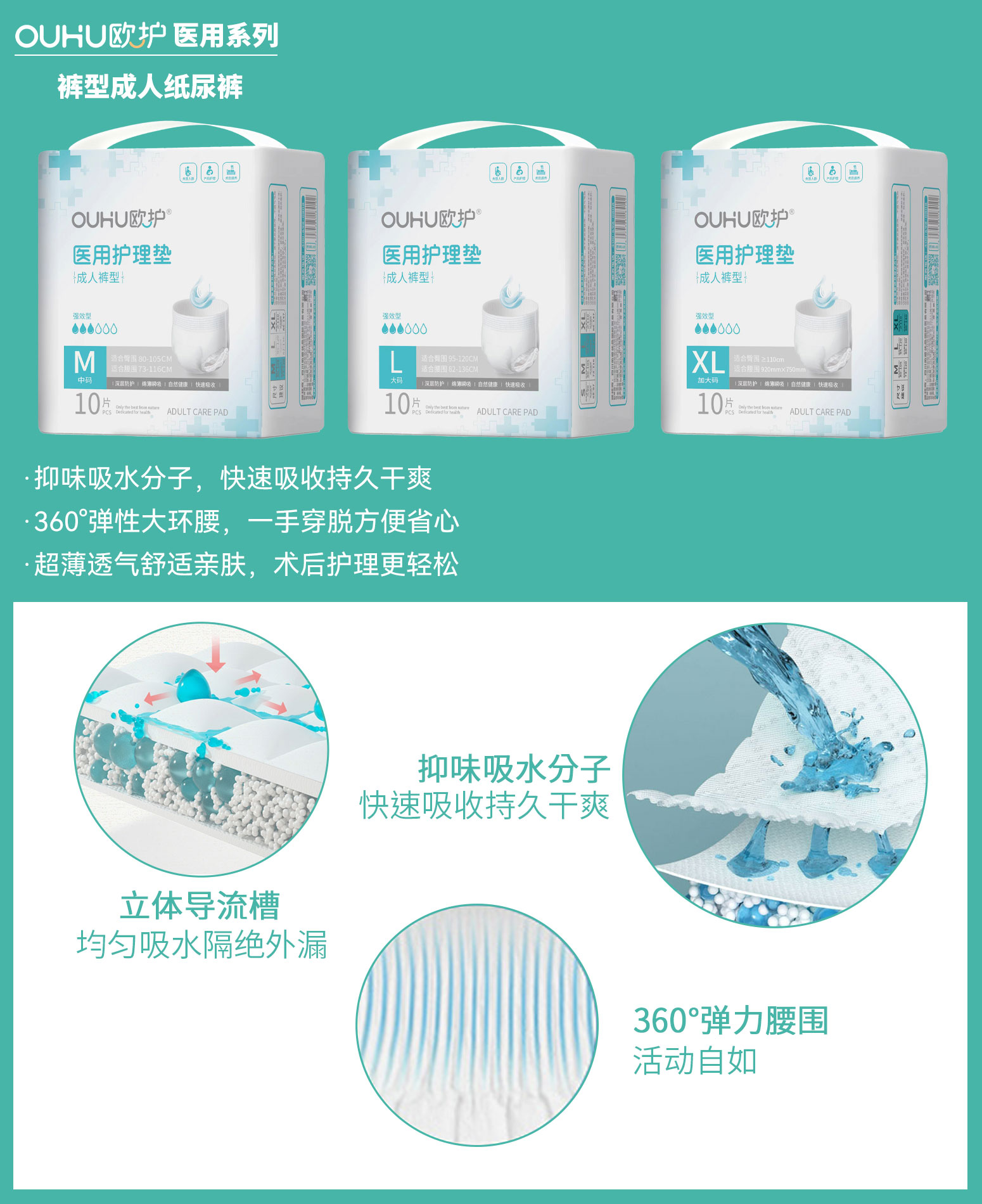 描述:·抑味吸水分子,快速吸收持久干爽·360°弹性大环腰,一手穿脱方便省心·超薄透气舒适亲肤,术后护理更轻松